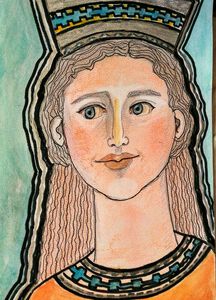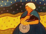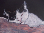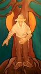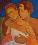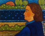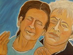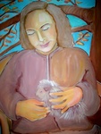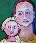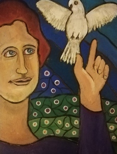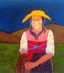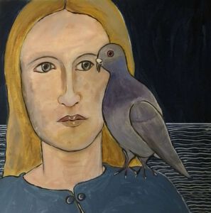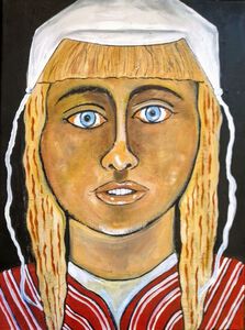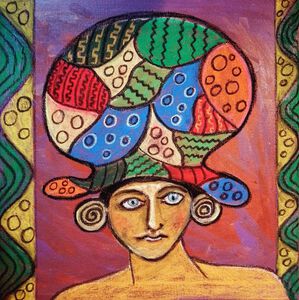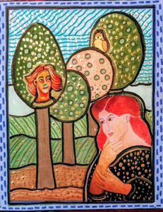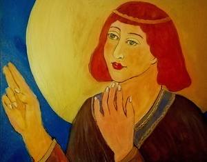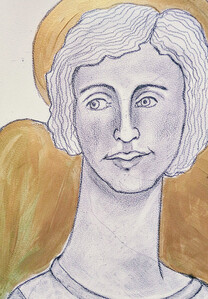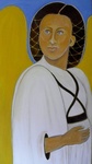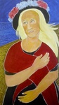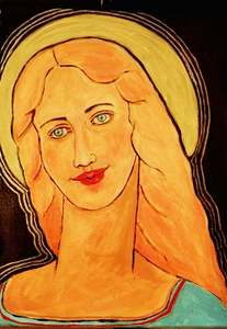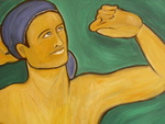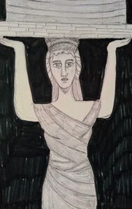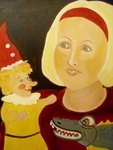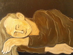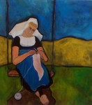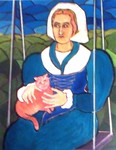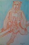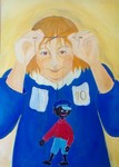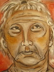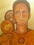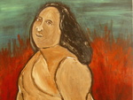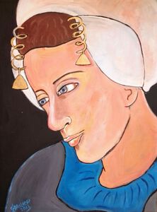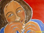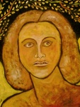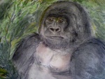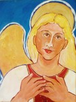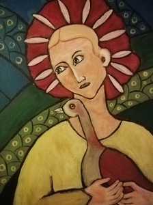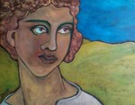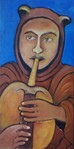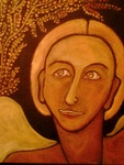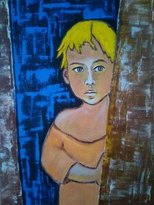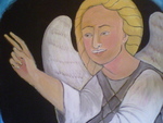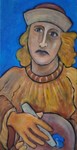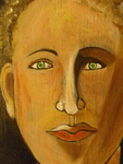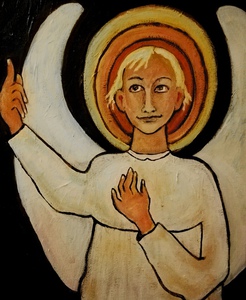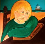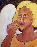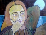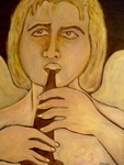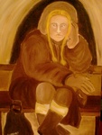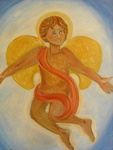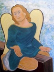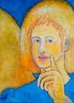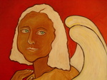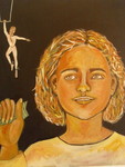 2010Dit is een van de luchtboogfigurtjes die op de Sint Jan in ' S Hertogenbosch zitten. Maar op mijn schilderijen laat ik ze terug komen in onze tijd die ze met de ogen van een mens kunnen bekijken.